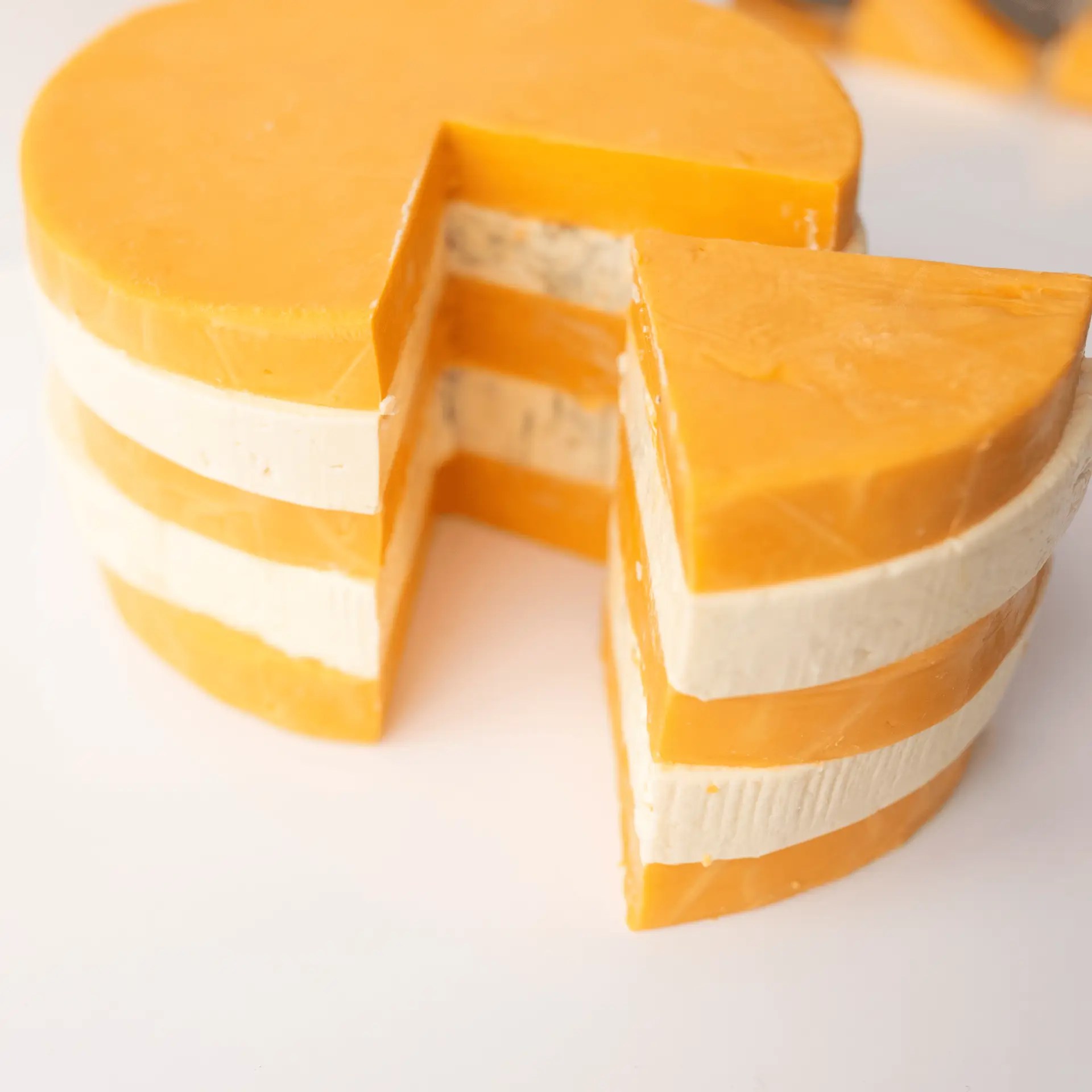 A true original, Serendipity is one of Shaft’s most popular specialty cheeses. It masterfully combines the brand’s signature 1-Year Aged Blue with a 1-Year Sharp Cheddar to create a visually striking and flavor-forward experience. Shaft’s 1-Year Blue is crafted in Wisconsin and then carefully aged in California under conditions that emulate the original mine shaft where the Shaft’s legacy began. The cheddar—also sourced from Wisconsin—is hand-cut and thoughtfully layered with rounds of aged blue, creating a distinctive stacked appearance and a harmonious balance of sharpness, creaminess, and tang.